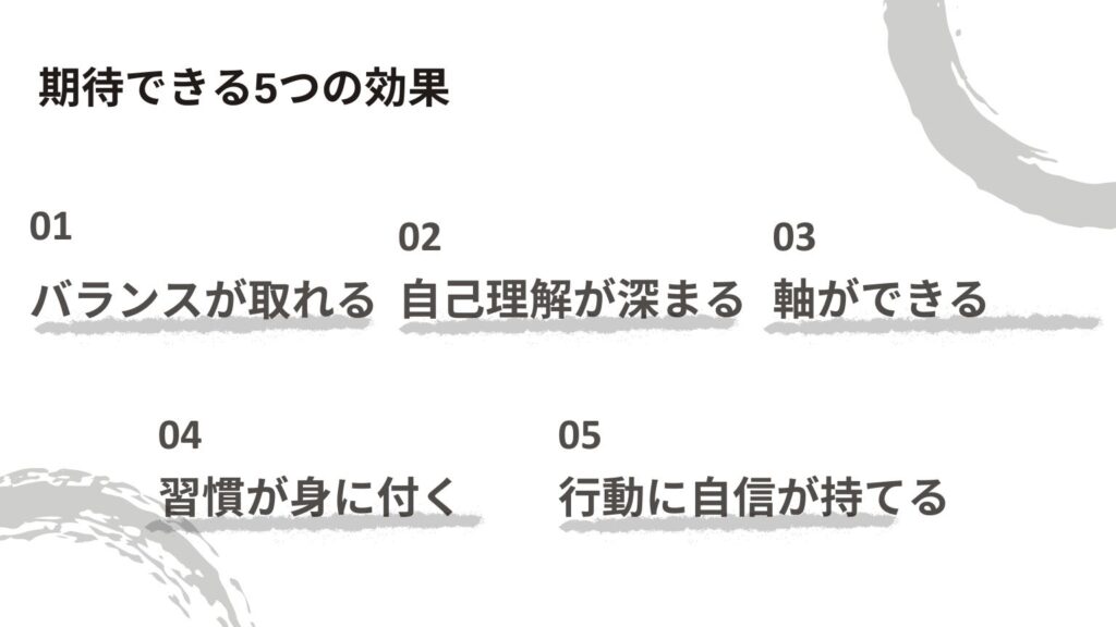 2. 実際の効果:バランスが取れる、自己理解が深まる、生き方の軸ができる、行動を習慣化できる、自信が持てる