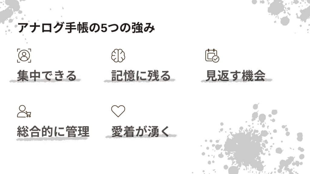 3. アナログ手帳のメリット:集中できる、記憶に残りやすい、見返す頻度が高い、総合的な自己管理ができる、個性と愛着が生まれる
