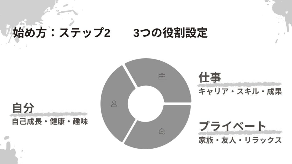 価値観が明確になったら、次は3つの役割を設定します。これは、バランス特化型システム手帳の核心部分です。