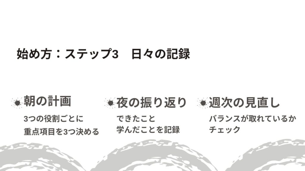 このように、3つの役割を意識して記録することで、自然とバランスの取れた生活を送れるようになります。