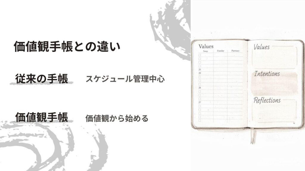 一方、価値観から始める手帳術は、まず「自分が大切にしたい価値観」を明確にすることから始めます。