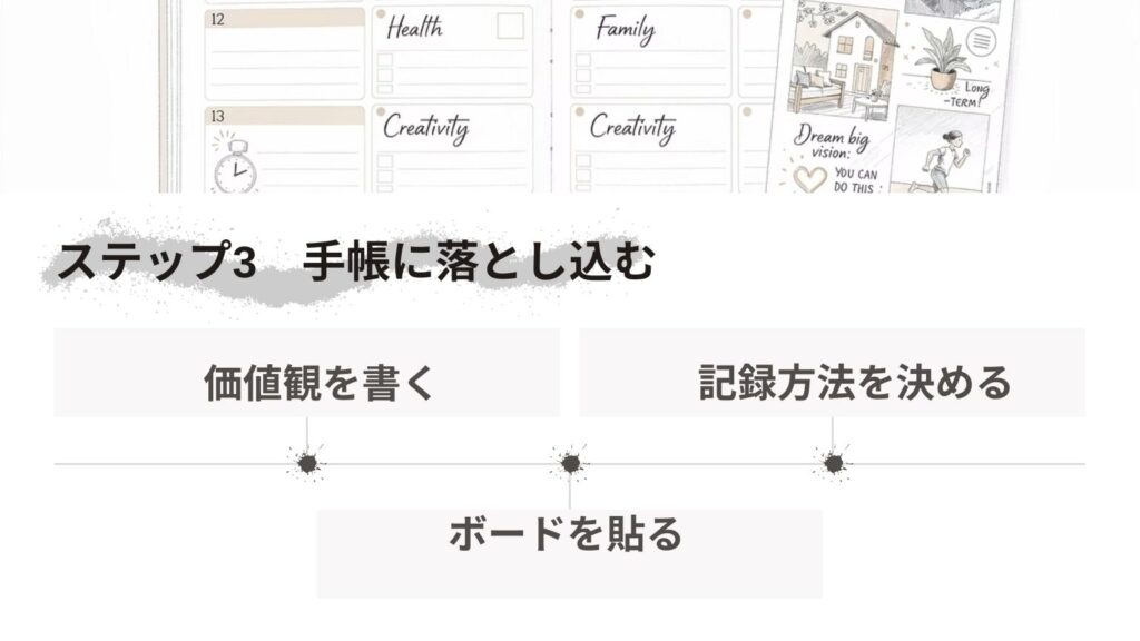 価値観が明確になり、理想の自分を描けたら、最後は手帳に落とし込むステップです。ここで、価値観に沿った行動を、日々の手帳に反映させます。
