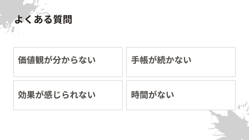 A:価値観から始める手帳術は、1日10分から始められます。無理をせず、できる範囲で続けることが大切です。