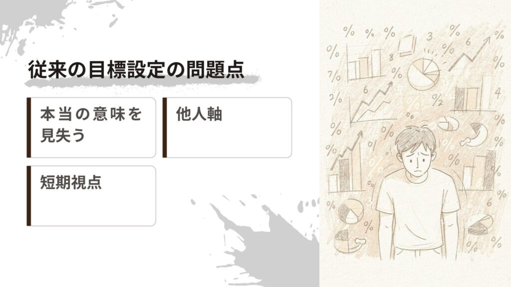従来の目標設定は「年収○○万円」「体重△△kg」など、数字や期限を重視しがちです。これだと、目標の本当の意味や、自分らしさがおろそかになりがちで、やる気が続かず途中で挫折しやすいというデメリットがあります。また、周りに流されて目標を決めてしまい、達成しても満足感が得られないことも少なくありません。