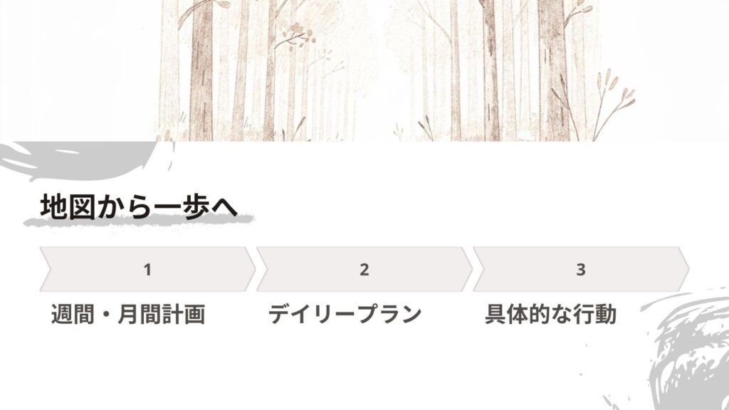 週間計画や月間プランニングが「地図」だとしたら、デイリープランは「その地図で、今日はどの道を進むか選んで具体的に歩き始める」ための工程です。