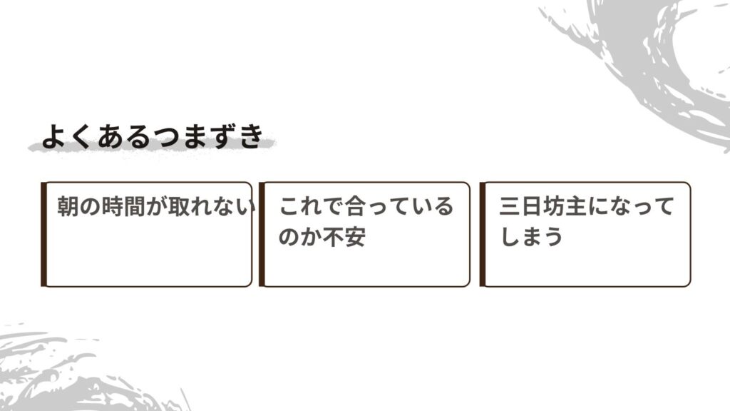 - 「朝の時間が取れない…」そんなふうに感じる時は、無理に長い時間を確保しようとしなくて大丈夫です。まずは“1分だけでもいいから”という気持ちで始めてみませんか?短い時間でも、毎日続けることで大きな変化が生まれます。