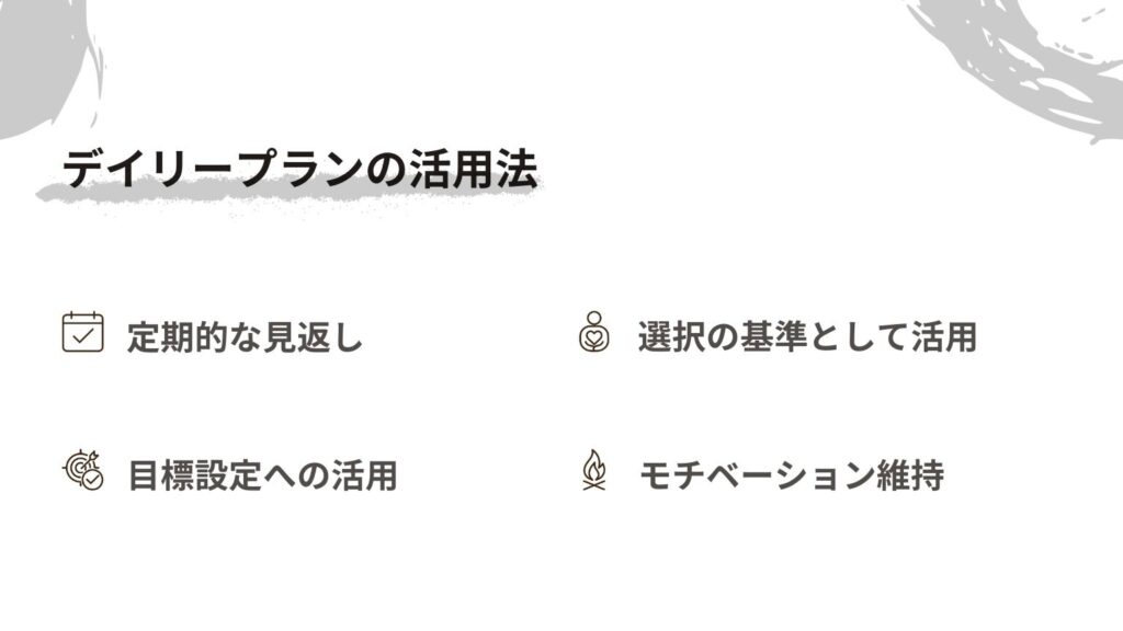 価値観ベースデイリープランを立てたら、次はそれを活用していきましょう!デイリープランは立てて終わりではありません。継続して活用することで、継続率が大幅に向上します。ここでは、デイリープランの効果的な活用法をお伝えします。