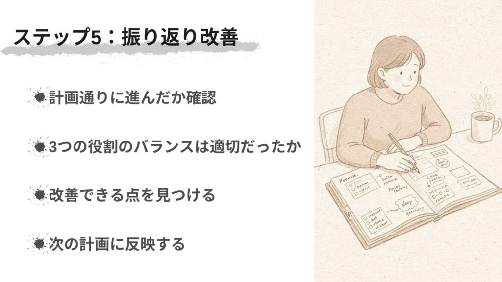 このステップの目的は、時間の使い方を振り返り、改善を重ねることです。