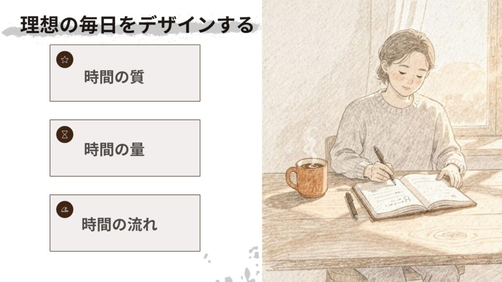 理想の毎日をデザインするには、3つの要素を意識することが重要です。まず、時間の質です。単に時間を使うのではなく、時間の使い方の質を高めることが大切です。次に、時間の量があります。各役割に適切な時間を配分することで、バランスの取れた生活を実現できます。最後に、時間の流れです。1日の流れを自然で心地よいものにすることで、ストレスなく理想の毎日を送ることができます。