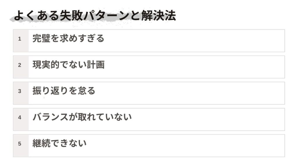解決法としては、まず現実的な計画を立てることが重要です。自分の能力と時間を正確に把握し、無理のない範囲で計画を立てます。また、バッファ時間を確保することで、予期しない出来事に対応できる余裕を持ちます。そして、段階的に目標を上げていくことで、無理なく成長していけます。