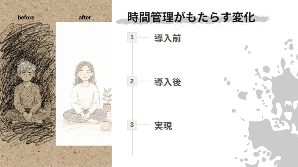 しかし、時間管理導入後は、3つの役割のバランスを意識した時間配分ができるようになり、理想の1日の時間設計を実現できます。継続的な振り返りと改善により、時間管理が最適化されていきます。