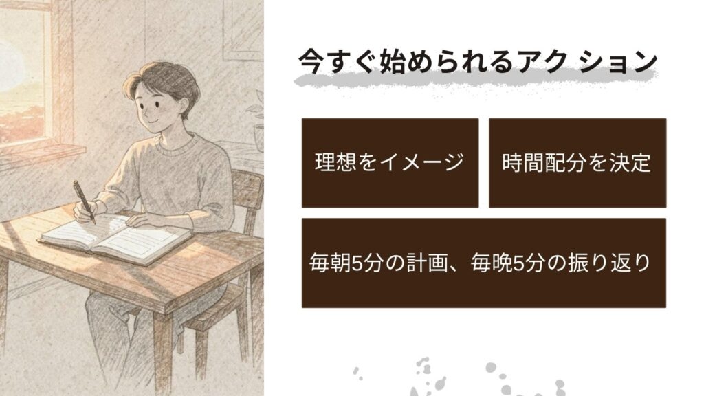まず、理想の1日の流れを書き出します。次に、各時間帯に何をしたいかを具体的に考えます。そして、現実とのギャップを認識します。この作業には15分程度の時間をかけて、じっくりと理想の1日をイメージしましょう。