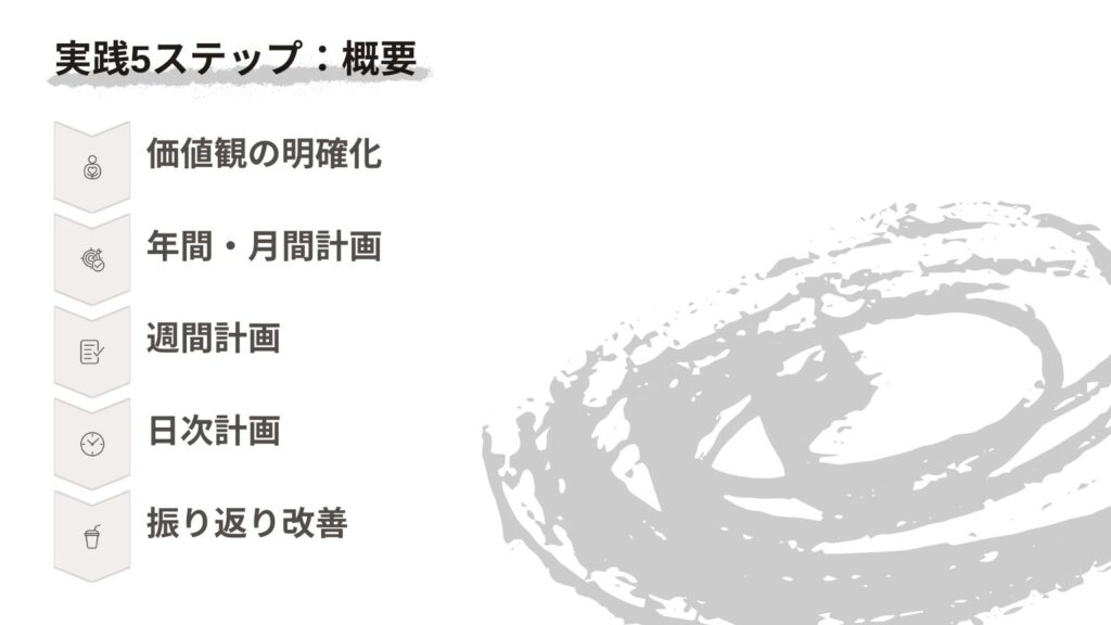 具体的な手順として、まず自分の価値観を書き出します。次に、3つの役割(仕事・プライベート・自己成長)の重要度を決めます。そして、理想の1日の時間配分をイメージします。