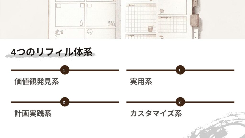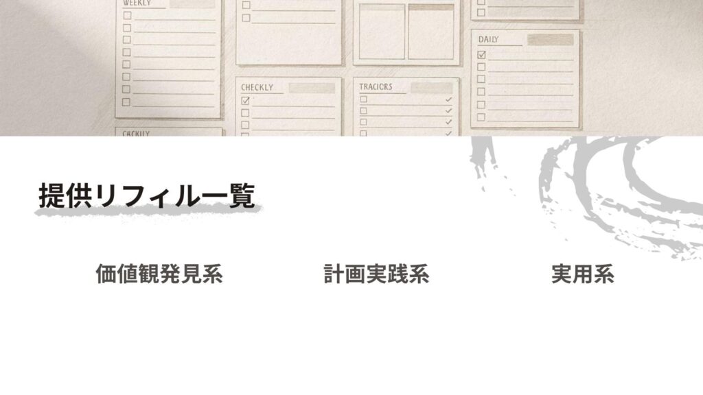 価値観に基づいた計画を立て、実行するためのリフィル群です。