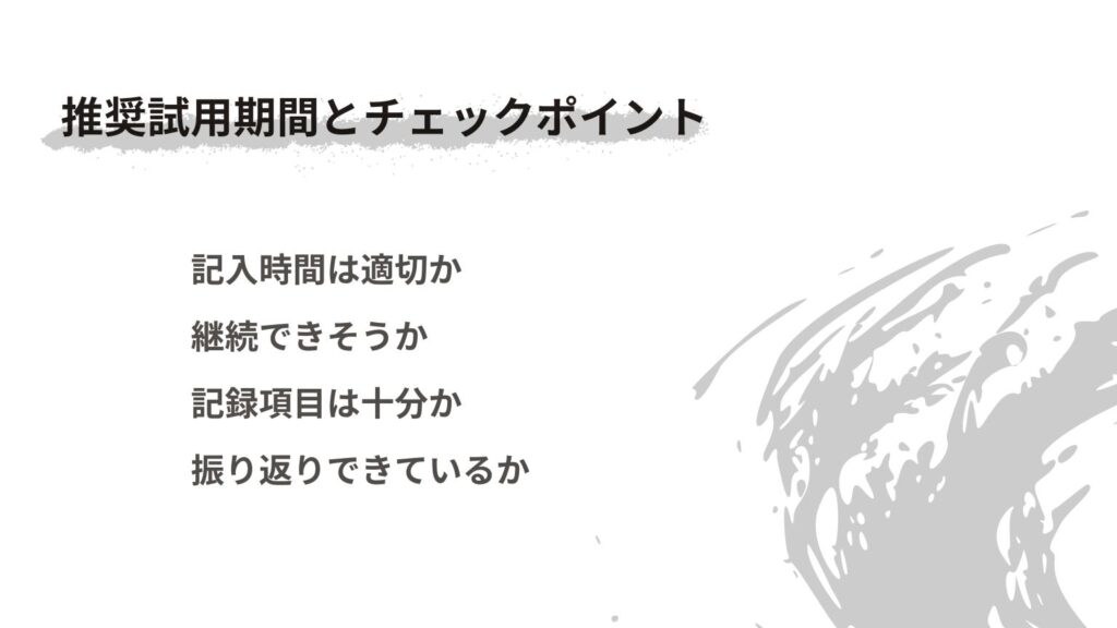 - 記録項目・フォーマットが最小限のため、丁寧な振り返りや行動の細分化には不向き
