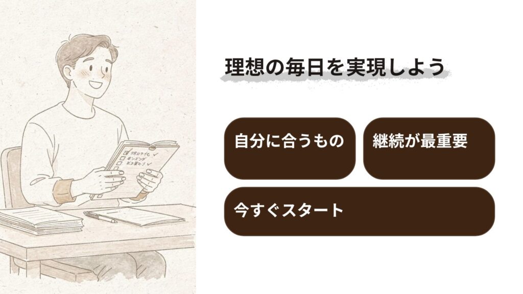 デイリーページは、あなたの理想の人生を実現するための最も重要なツールです。L版、M版、S版それぞれに異なる特徴がありますが、重要なのは自分に合うものを見つけることです。