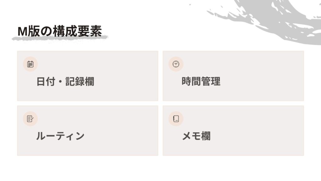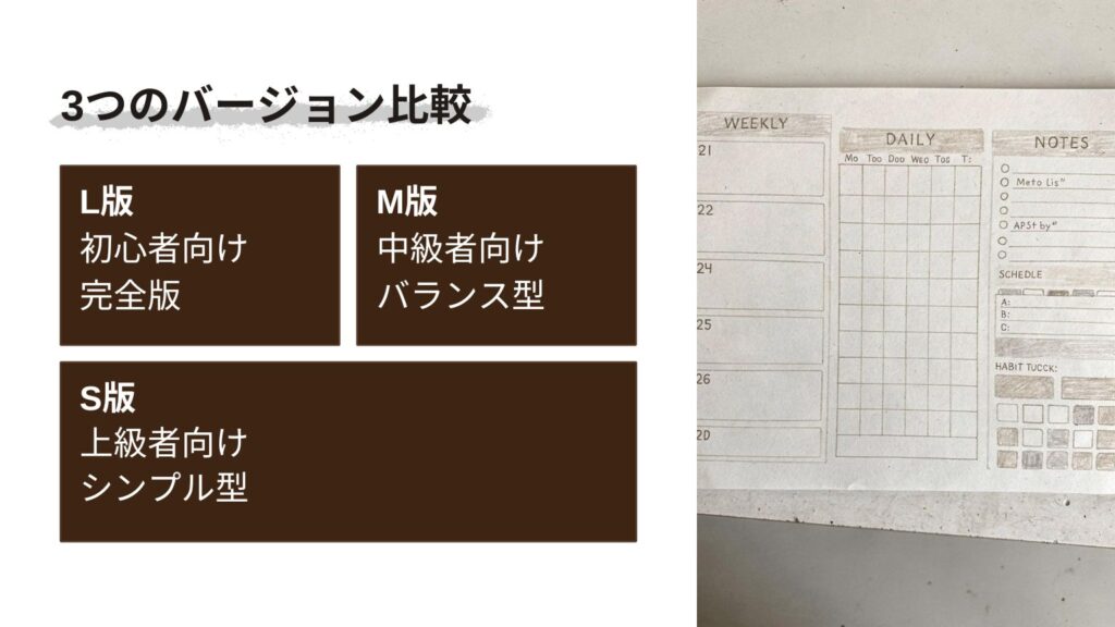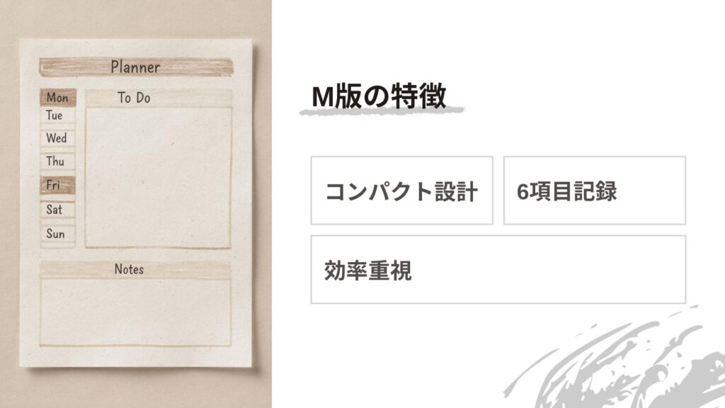M版は“ちょうど良い充実感”があるため、決まった習慣や予定をサッと整理し、簡単な振り返りをこまめに続けたい方にピッタリです。