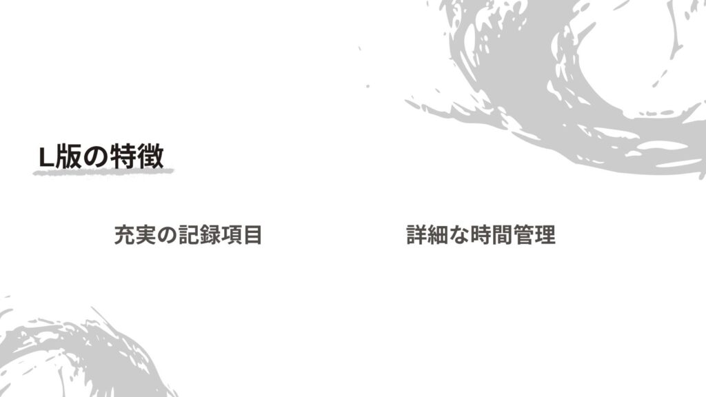 たとえば、「朝や夜にたっぷり10分以上ゆっくり手帳と向き合う時間がとれて、できるだけ細かい記録を残したい」と感じている人にはL版がぴったりです。L版は、項目が多くしっかり書けるので、1日の出来事や気持ちを丁寧に整理したい、毎日じっくり自分と向き合いたい方におすすめです。