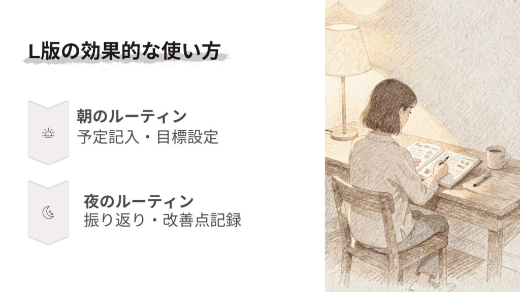 このように、朝と夜に項目ごとに記入を積み重ねることで、L版の良さを最大限に活かせます。最初は全部書けなくても大丈夫なので、自分のペースで無理なく続けてみましょう。