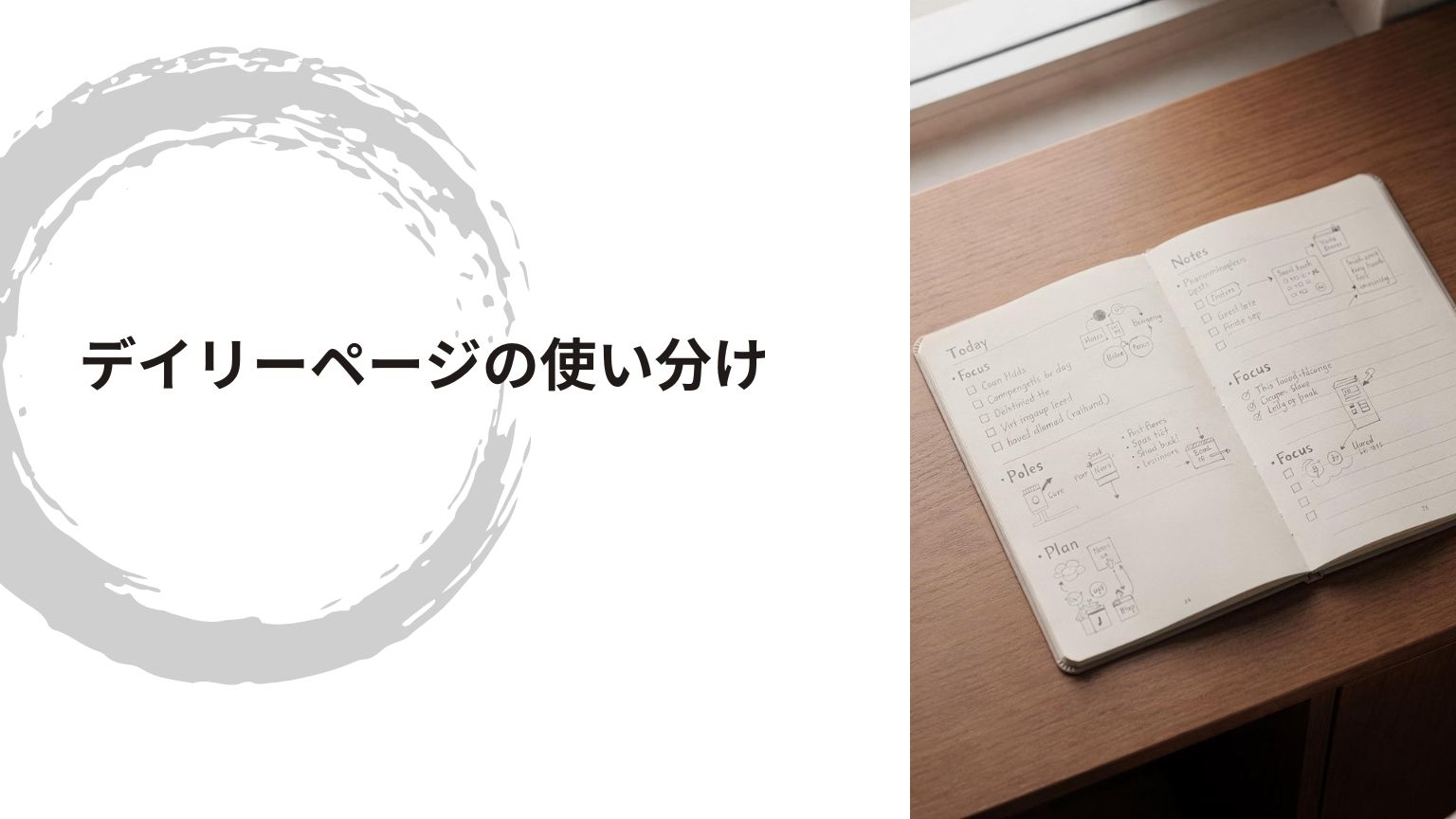 1週間で達成したい目標、大事なタスクやテーマを書き出します。週のスタート時に方向性・優先事項を明確にします。 - デイリーページ(日々の記録欄)
