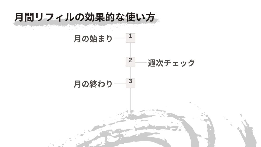 まずは年間リフィルに慣れたら、次は月間→週間…と、1つずつ増やしていきましょう。