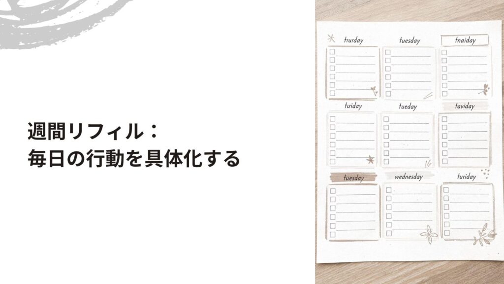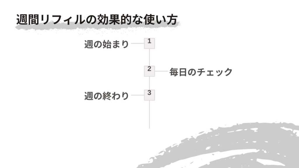 週間リフィルは「1週間の進む方向性・やるべきこと」を短時間で定め、軌道修正と達成を繰り返すサイクルを作りやすくします。以下、使い方の流れ例です。