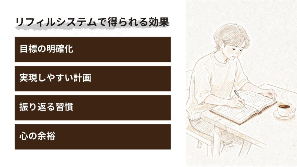 つまり、リフィルシステムを使い分けることで「目標達成がしやすい」「自分を振り返る習慣が身につく」「ストレスが減る」「自分の成長を実感できる」といった良い変化が日々現れてくるのです。