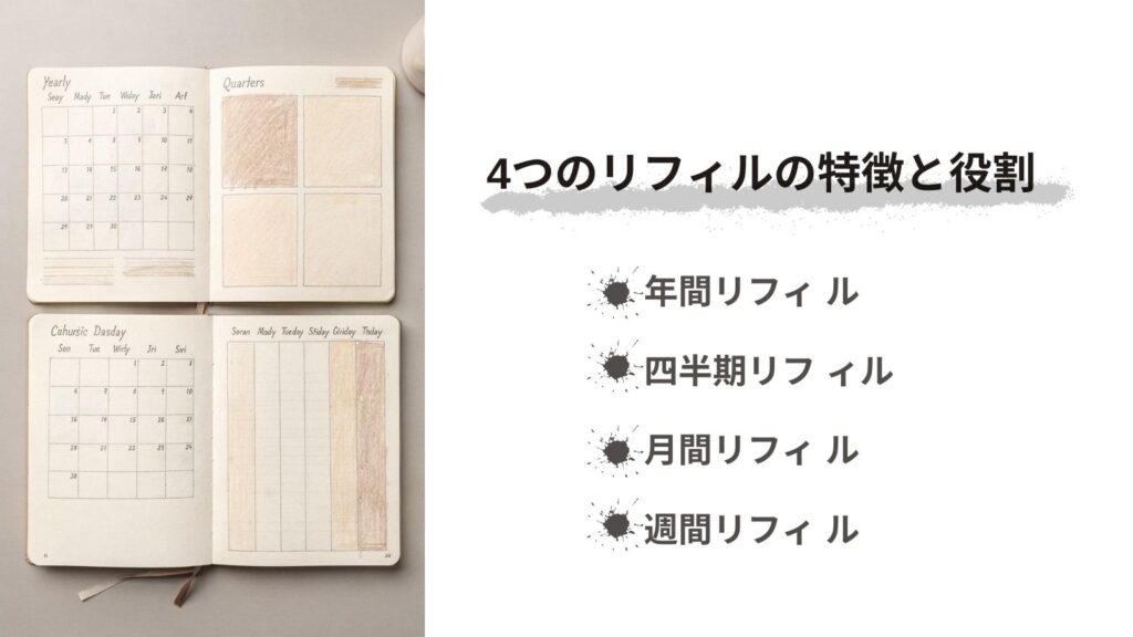 「年間計画は立てたけど、月間・週間でどう活かせばいいの?」そんな悩みを抱えている方に朗報です。pile-up-plannerでは、年間・四半期・月間・週間の4つのリフィルを提供しており、それぞれが連携して効果的な手帳システムを構築できます。最適なリフィル活用法を徹底解説します。