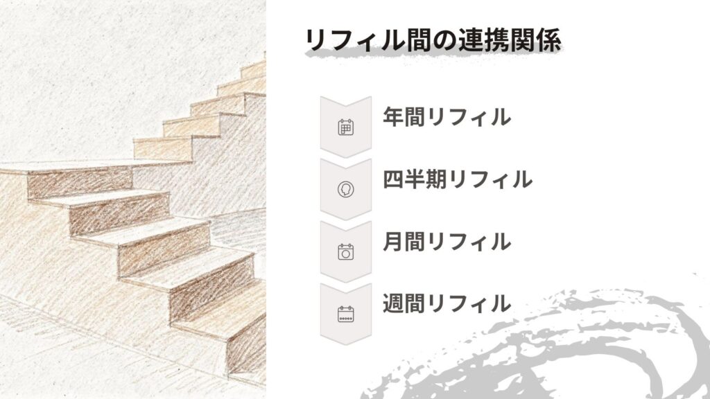 こうして段階ごとに目標を分解し、最後は毎日の行動に結びつけていくことで、やるべきことが整理され、迷いなく進めるようになります。はじめてリフィルを使う場合は、「大きな目標」から「毎日の行動」までが、自然と階段を上るようにつながっているとイメージすると分かりやすいでしょう。