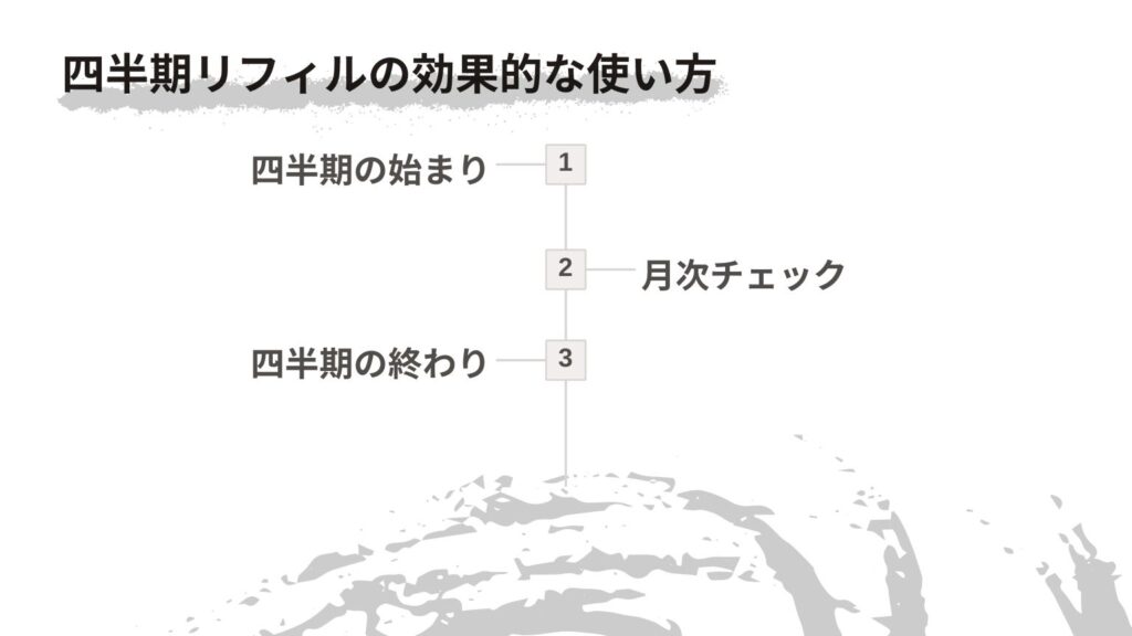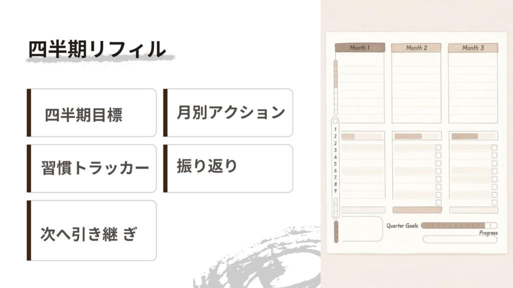 - 四半期リフィル:1年を3ヶ月ごとに区切り、年間目標をどこまで進めるか具体化します。春・夏・秋・冬など、季節ごとに自分のペースでテーマを立ててもよいでしょう。