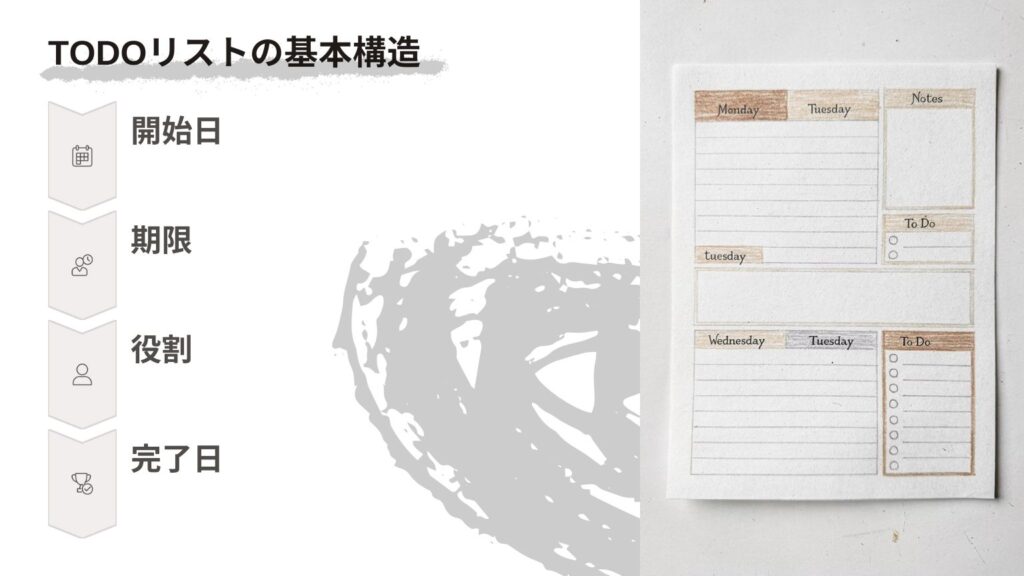 - 開始日と期限の設定:実行に移すタイミングと完了期限が明確になるため、「いつかやる」という曖昧さがなくなります。