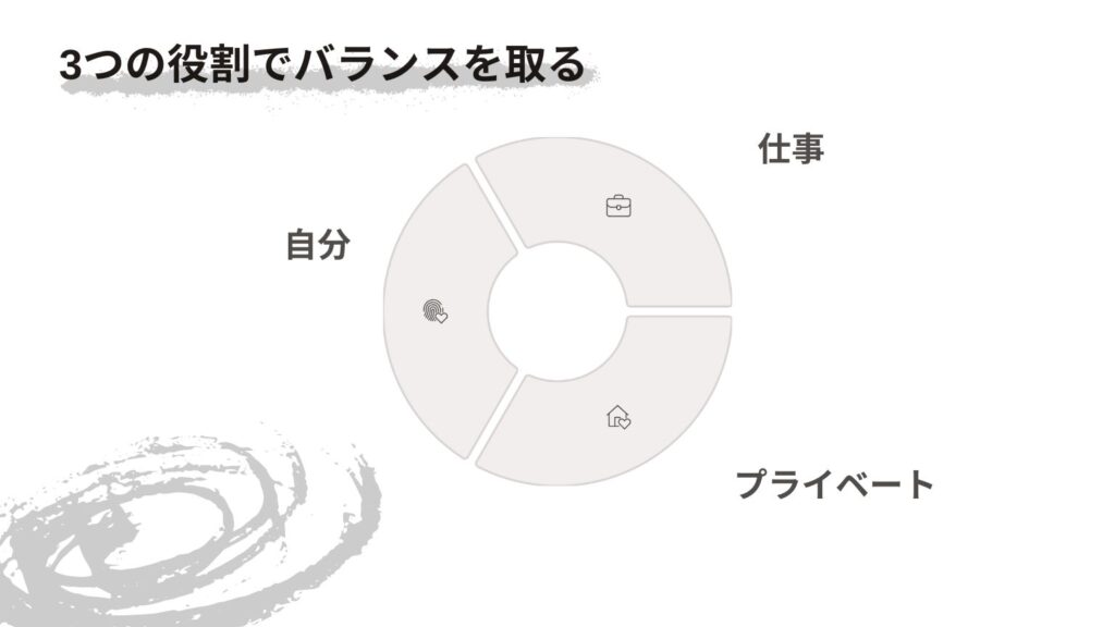 - 3つの役割のバランス:自分・仕事・プライベートのバランスを意識することで、どれか一つに偏ることなく、充実した毎日を送ることができます。