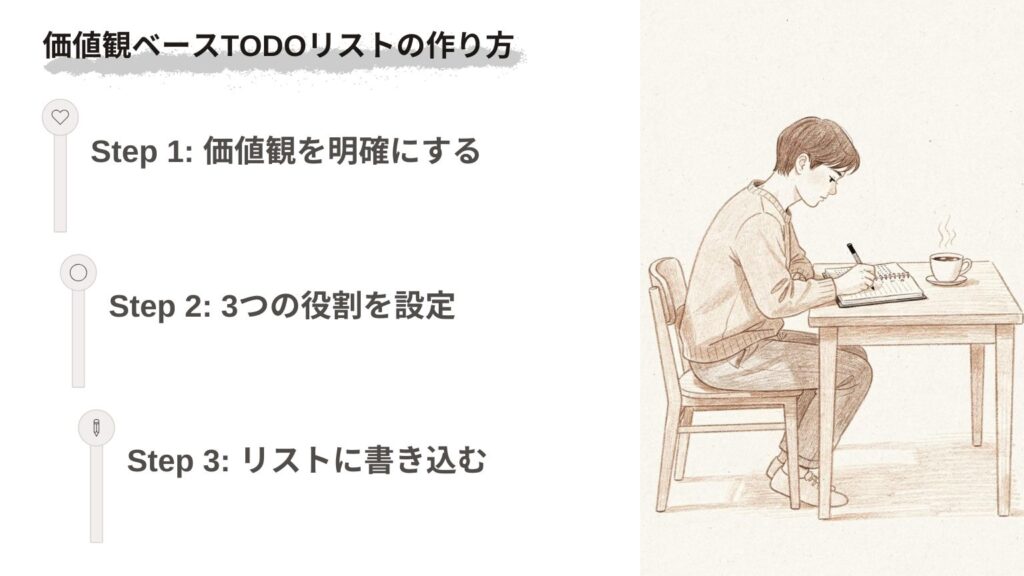 「TODOリスト作成の3ステップを視覚的に説明した図。価値観の選定→タスク設定→記入の流れが明確」