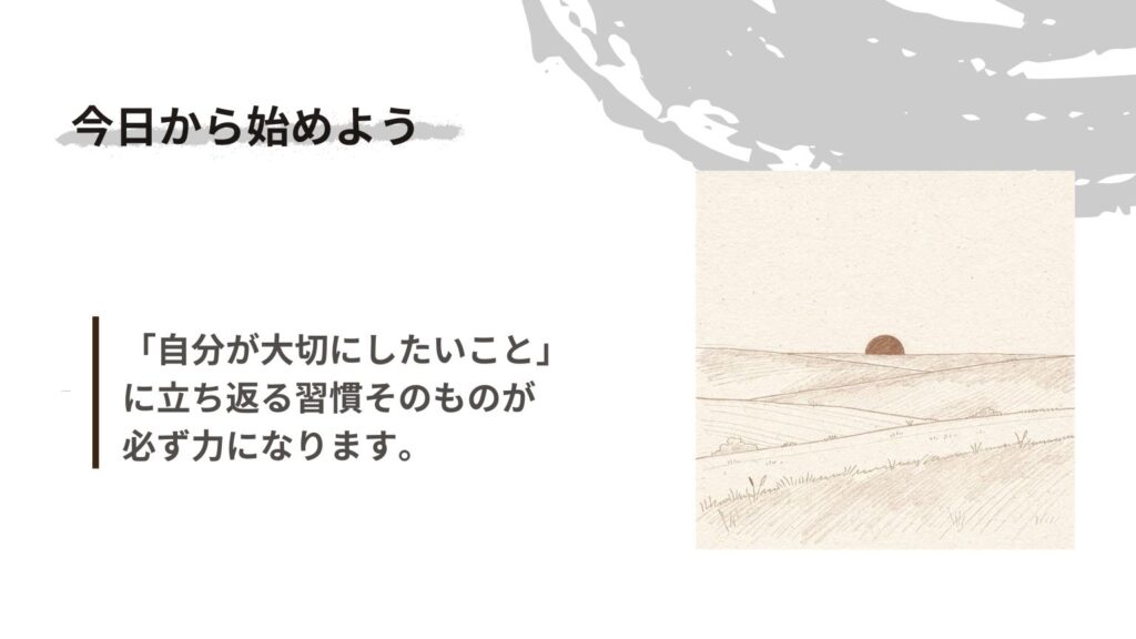 (「あれ、まだやってなかった…」という後悔が減り、「今日から始めよう」と行動に移せる感覚です) - 優先順位の明確化:価値観に基づいて優先順位を設定することで、本当に大切なことに集中できる