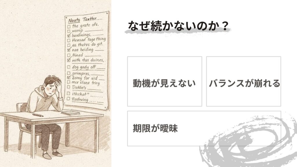 「TODOリストを作っても続かない理由を表現した図解、挫折の原因を視覚化」