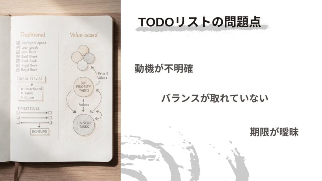 「やるべきこと」を並べるだけでは、なぜそのタスクに取り組むのかという動機が明確になりません。動機がなければ、モチベーションは続かず、優先順位も曖昧になります。
