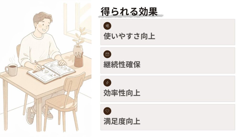 - 効果:常に自分に最適化された手帳システムを維持できる