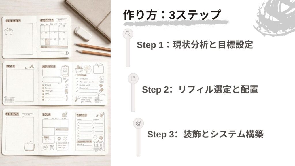 「手帳カスタマイズの概念図、カスタマイズの流れを視覚化」