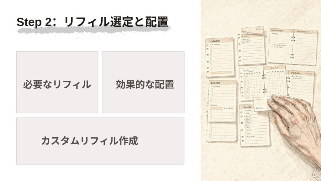 → 例:「価値観リフィル」「健康管理記録ページ」など、自分の価値観に合ったリフィルを選定します。 - 継続可能なリフィル