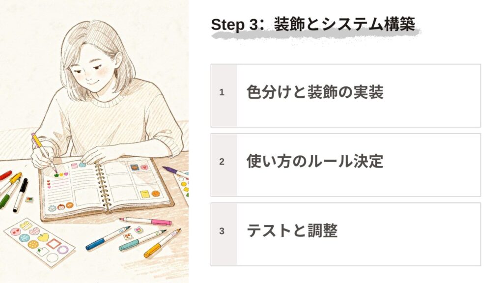 → 例えば「色分けでカテゴリーを明確化」「イラストやステッカーで親しみやすさを演出」など、見た目を整えることで、手帳を開くのが楽しみになります。どのページも「自分らしさ」が反映されているので、「これは私の手帳だ」という特別感を味わえます。 - システム(使い方):手帳をどのように使うか