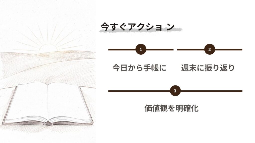 - 今日から手帳に1行記録:完璧を求めず、まずは始める