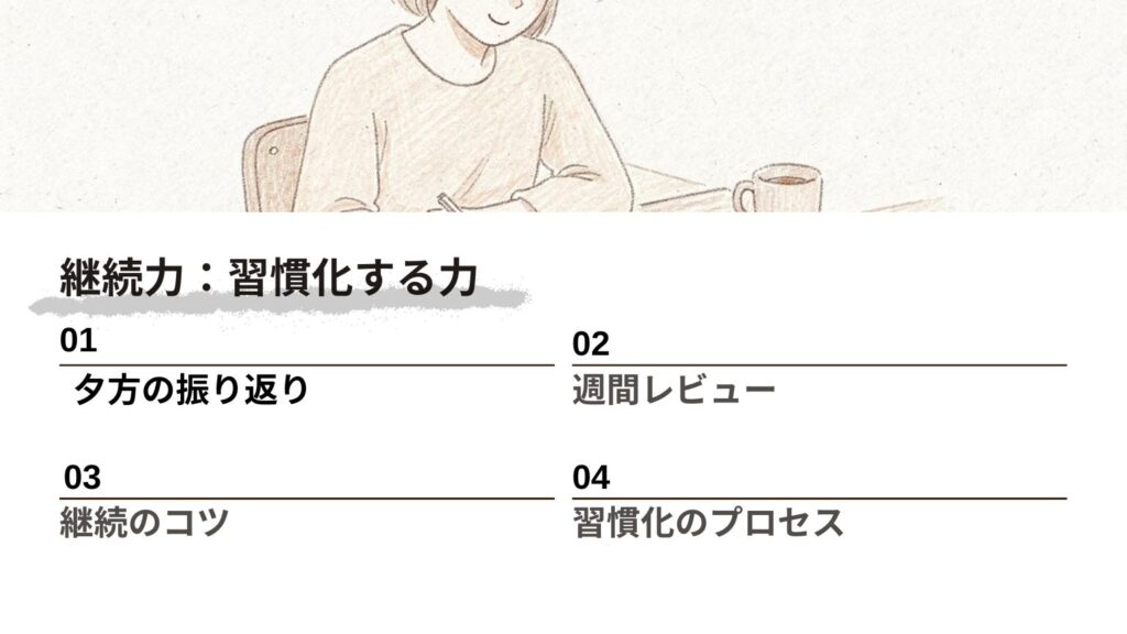 - 継続的な振り返り:毎日の記録と振り返りが自己認識を高める